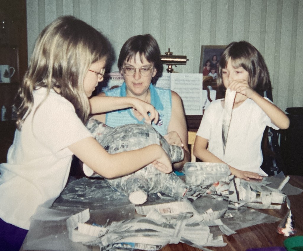 We also made our own piñata for the party. This was a messy, time-consuming project, and you might prefer to buy a piñata. But I was a stay-at-home mom and had more time than money. Besides, our party preparations always involved all three daughters, and messy art was fun for them. At our house, a mess was a sign of creativity and fun!