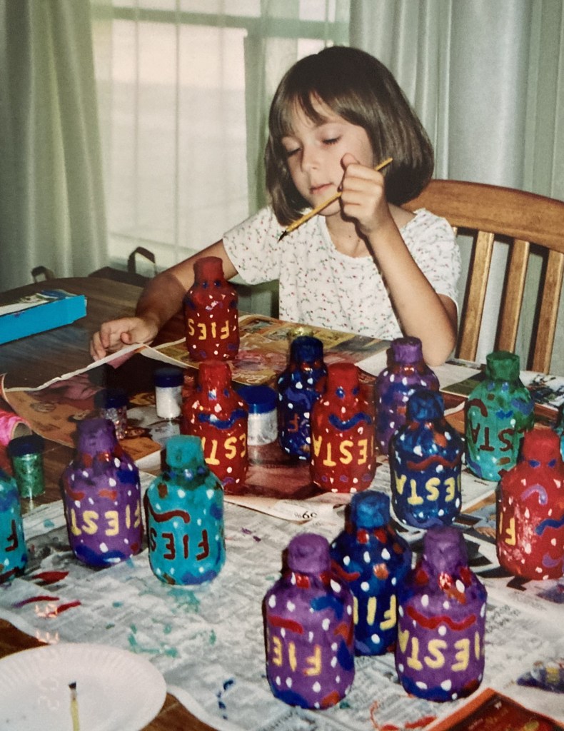 I added the word FIESTA to each bottle, and then our daughters helped decorate each maraca with dots, swirls, and their favorite– Shimmer and Shine paint– to make them sparkle!