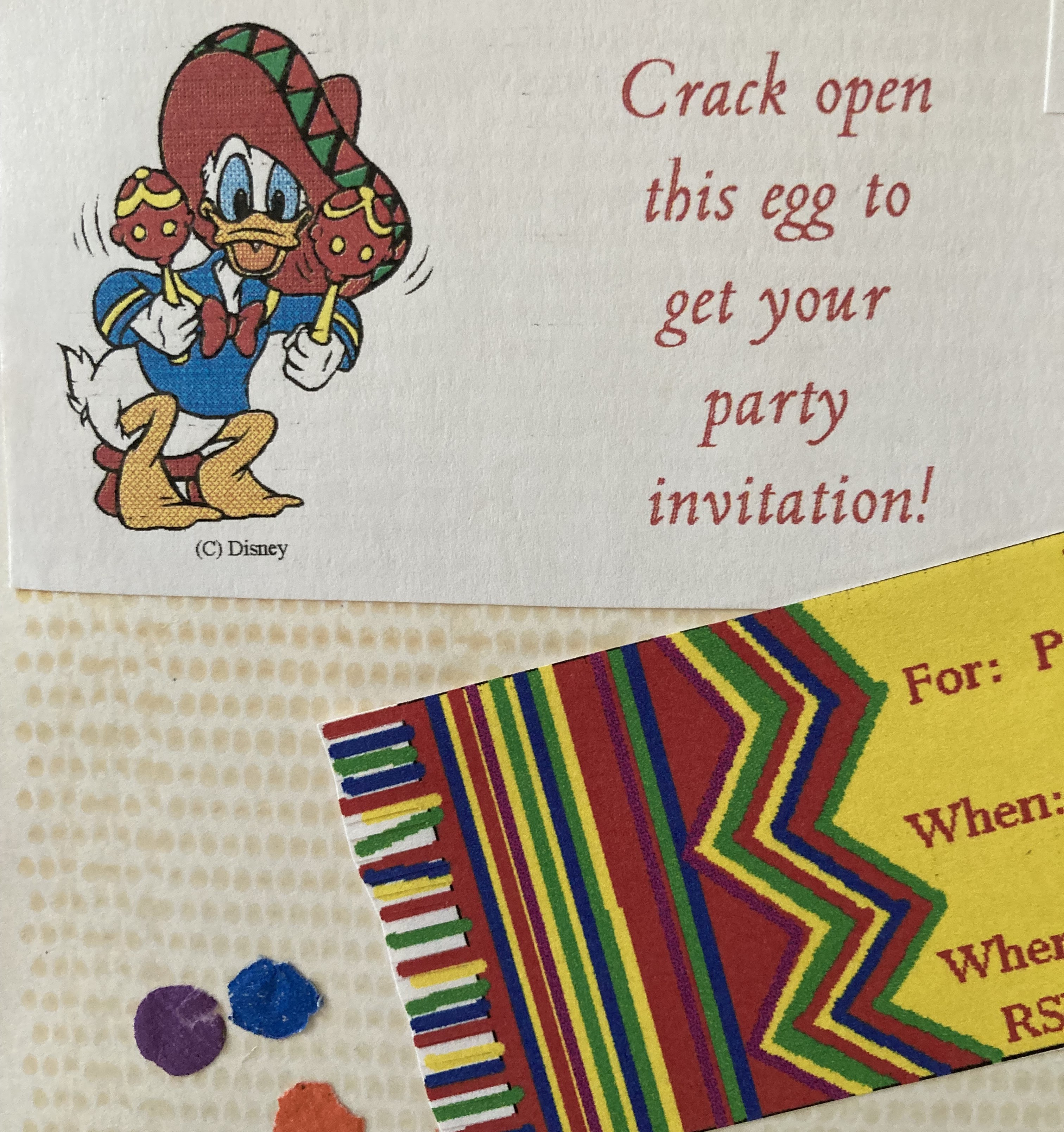 The party details (when, where, and RSVP instructions) were printed on slips of paper that I had created on our home computer to resemble little serapes. The papers were rolled up and inserted into hollow egg shells that had been dyed with Easter egg dye. The shells were then filled with tissue paper confetti, and squares of tissue paper were glued over the top of the egg with white glue. Finally, the message-laden cascarones were carefully packed in tissue paper in tiny white boxes wrapped with colorful ribbon. A note to crack open the egg to reveal an invitation was attached to the outside of each box.