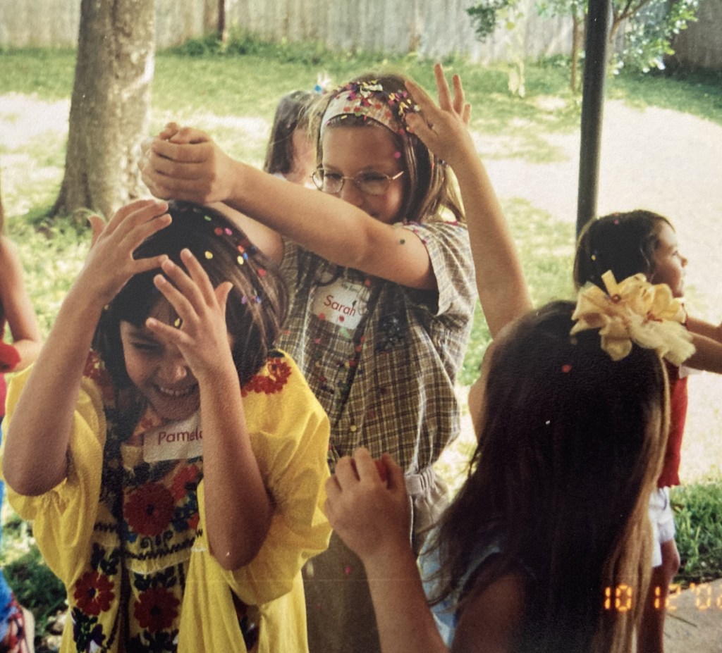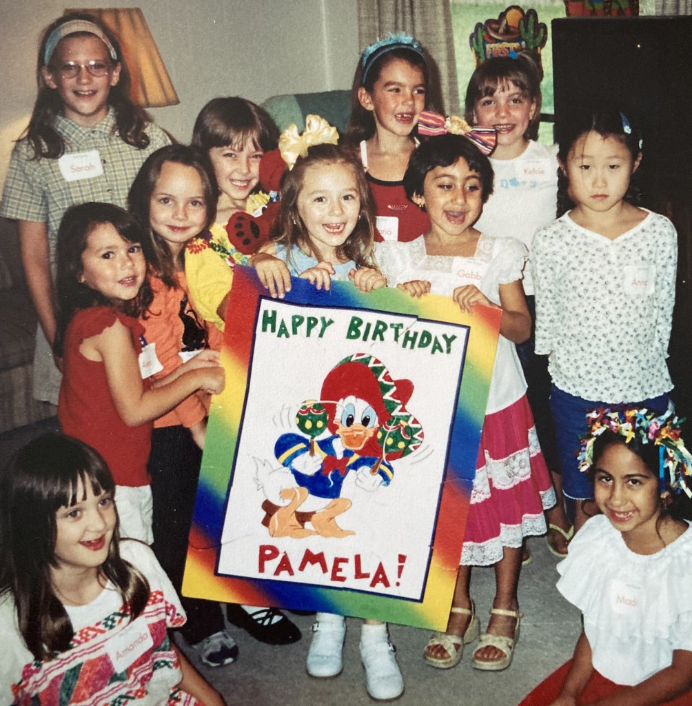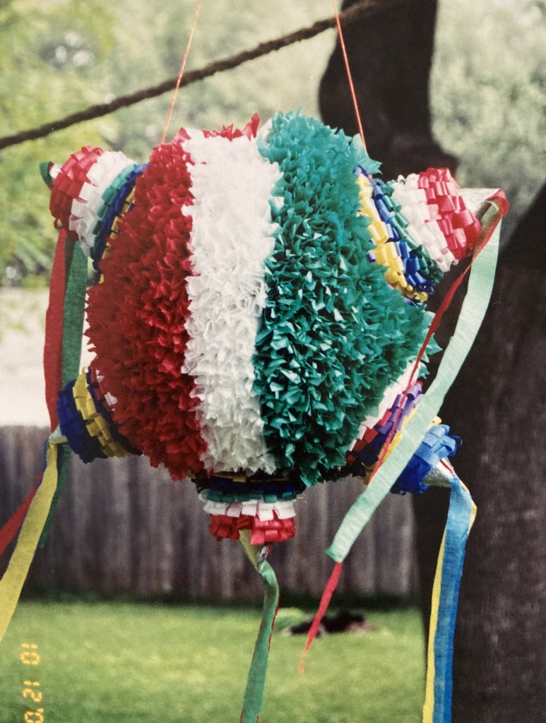 Our piñata was filled with packs of candy and treats– one for each child. When the piñata finally broke open, instead of a free-for-all for candy, everyone took one pack. Some children might like the typical, more aggressive style of collecting treats, but our daughters never enjoyed that part. With this method, everyone still shared in the fun and the reward.