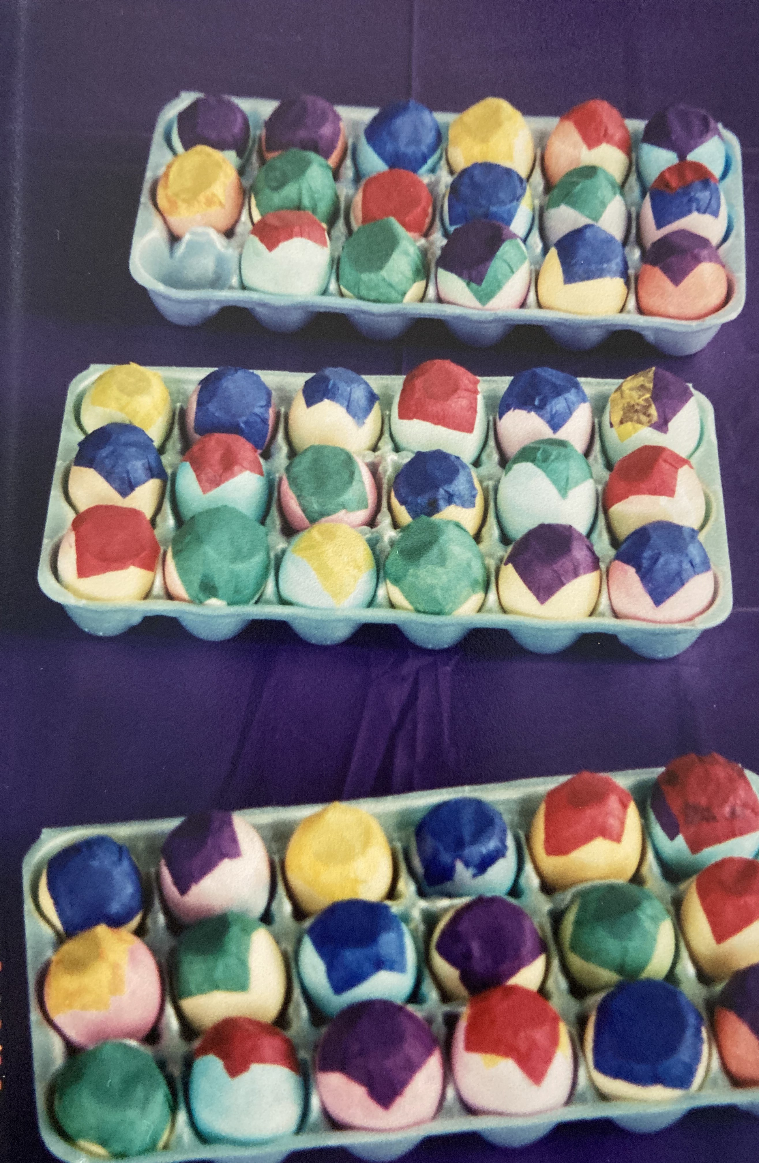 Note: If you want the completed cascarones to fit well into an egg carton, make the opening in the wide part of each egg. The narrower end of the egg will fit down better into the carton.